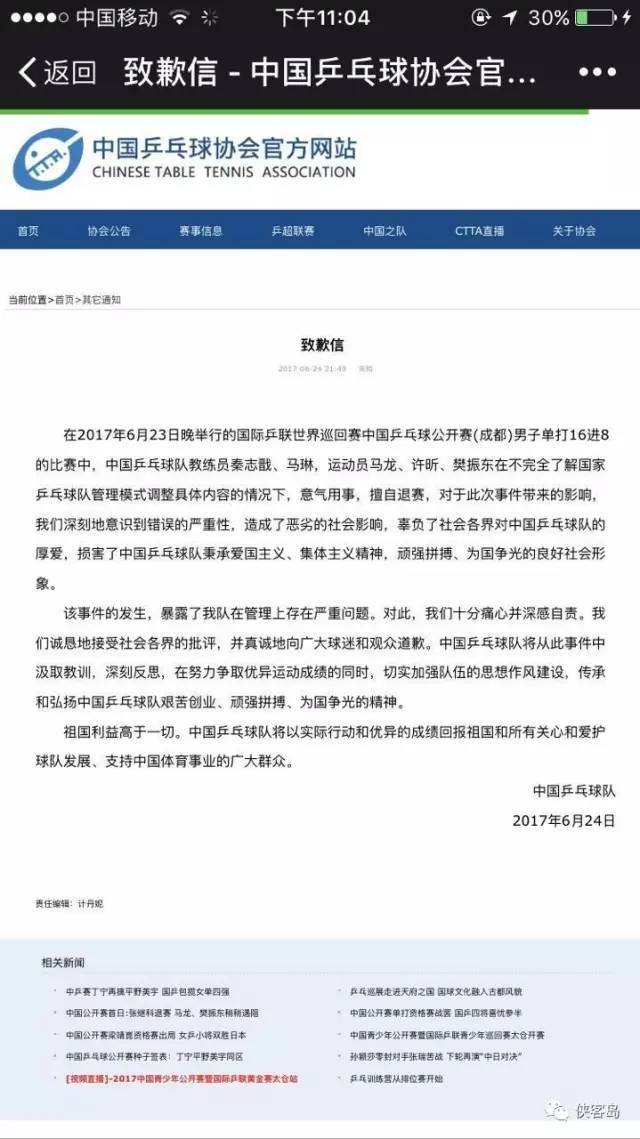侠客岛 意气用事 擅自退赛 来自国乒的深夜致歉 新闻 腾讯网