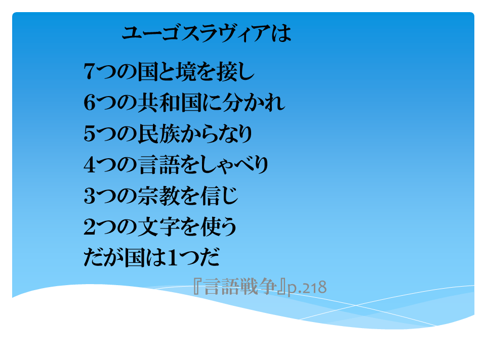 7つの国境 6つの共和国 5つの民族 4つの言語 3つの宗教 2つの文字を持つ 1つの国家