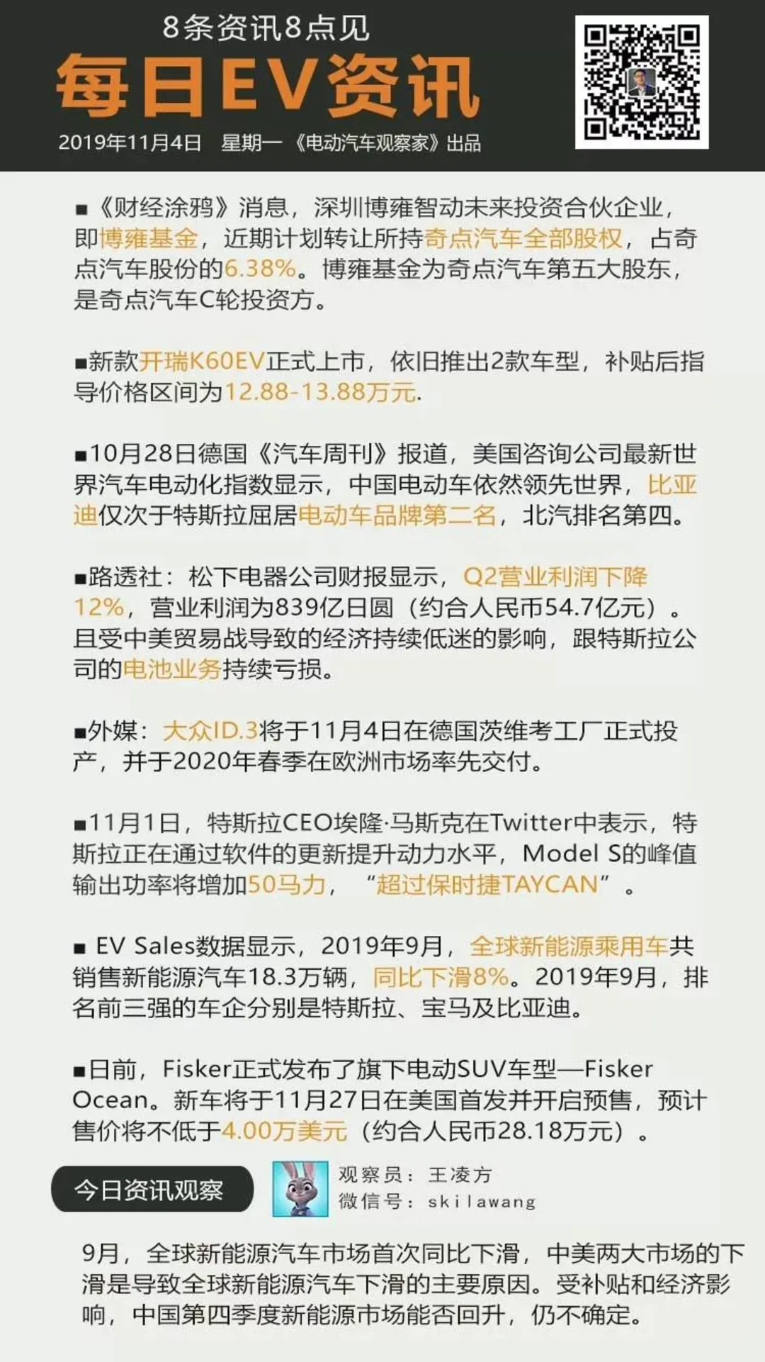 每日资讯 博雍基金计划转让奇点股权 开瑞k60ev上市 9月全球新能源市场首下滑 有车以后